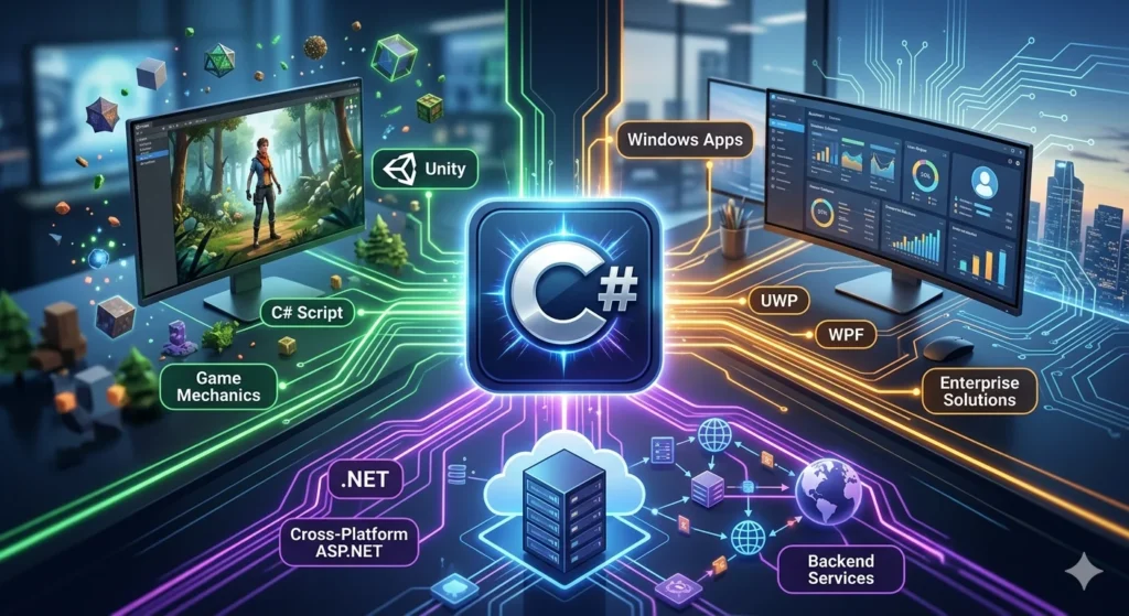 - Versatilidad Total: Es de los pocos lenguajes que te permiten ser un desarrollador de videojuegos profesional en Unity, un arquitecto de software para Windows o un experto en Backend con .NET, todo usando la misma sintaxis.
