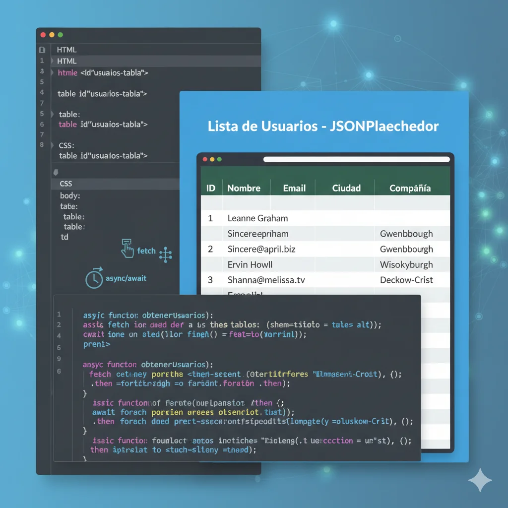 fetch(): Es la «mano» que va a la URL de JSONPlaceholder a pedir la información.async/await: Lo usamos para que el código espere a que la API responda antes de intentar dibujar la tabla (ya que el internet no es instantáneo).- Template Literals (las comillas