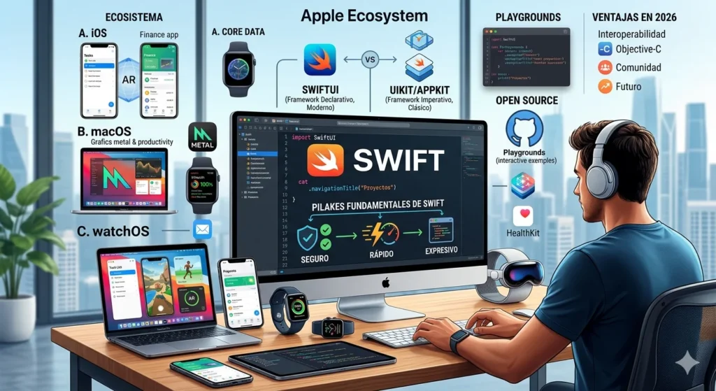 - Rendimiento y Seguridad: Al eliminar errores comunes como los punteros nulos y ofrecer un rendimiento cercano a C++, Swift garantiza aplicaciones fluidas que aprovechan al máximo el hardware de los chips Apple Silicon.