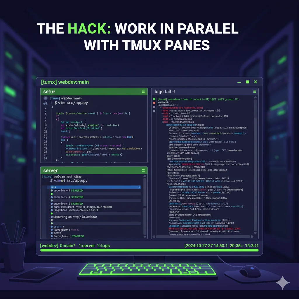 2. Dividir verticalmente (para el código y el servidor): Presionas Ctrl + b, luego %.